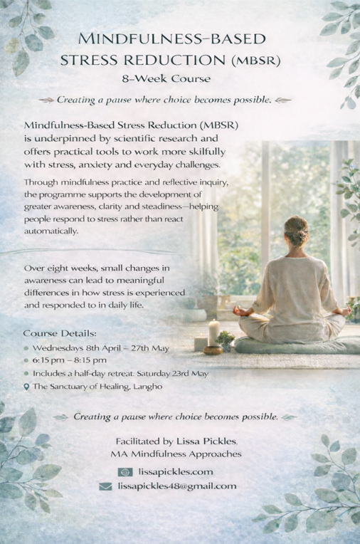 Starting on 8th April, I’m delighted to offer an 8-week Mindfulness-Based Stress Reduction (MBSR) programme at The Sanctuary of Healing, Langho.